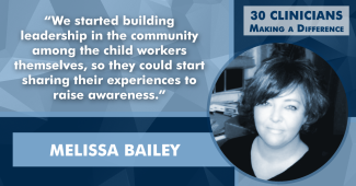Help us honor the work of Melissa Bailey by sharing her profile. And, make sure to check out the profiles of all 30 clinicians at the 30 Clinicians Making a Difference webpage.