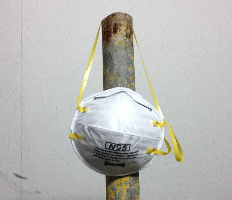 An N95 mask hanging on a pole. Photo by Kai Hendry.