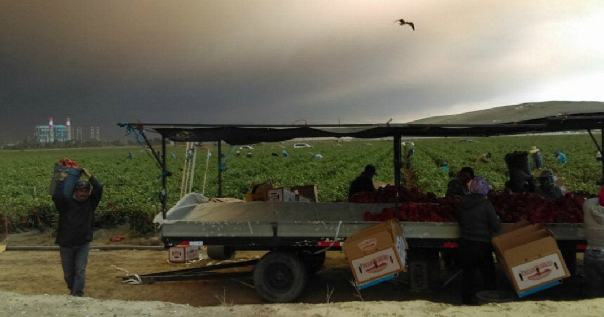Farmworkers working in agricultural field with heavy smoke in the air. Photo taken by Central Coast Alliance United for a Sustainable Economy