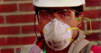 [A construction worker wearing a mask and other protective equipment. Photo by Earl Dotter ]