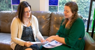 MCN's Jessica Candela working with Molly Jolliff on a webinar for those who provide support or services to Camp Fire survivors.