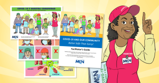 Infectious diseases, like COVID-19, can kill. But communities with access to good health information can protect themselves. Community health workers (CHWs) are a key component in providing evidence-based and up-to-date health content to communities, including around COVID-19. To support their efforts, Migrant Clinicians Network (MCN) has developed a new low-literacy, comic-based rotafolio, or flip chart, and an accompanying CHW guide to ensure effective program delivery, with funding from the Thoracic Foundation. Both the flip chart and guide are available in English and Spanish. The rotafolio translates basic health information on the spread of infectious diseases, vaccinations, and preventive public health actions. The guide expands on evidence-based information for CHWs and provides resources and websites so the CHW can easily look for updated information, which is particularly needed for fast-moving public health crises like COVID-19.