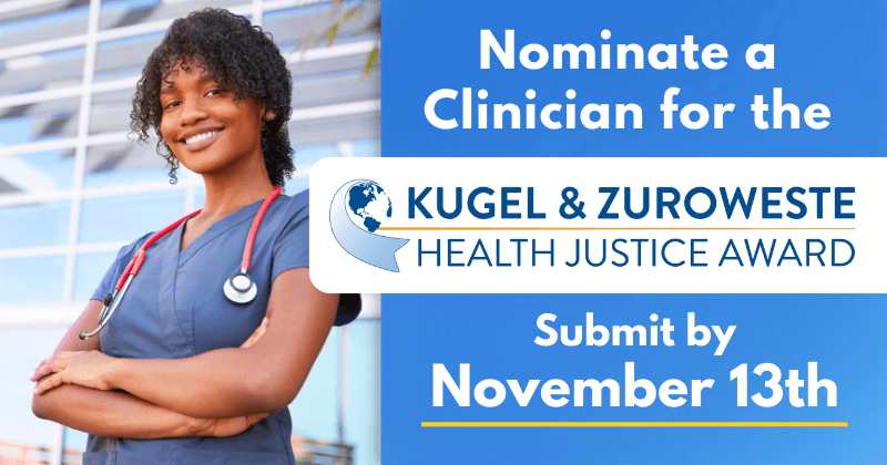 The process for nominating a colleague or peer for the Kugel & Zuroweste Health Justice Award is simple. Just click on this link to answer some basic questions about the candidate you have chosen to nominate, such as their educational background and years serving as a clinician/provider. You will also need to prepare a short essay (no more than 850 words) describing the rising star, their support for health justice, and their impact on the community they serve.