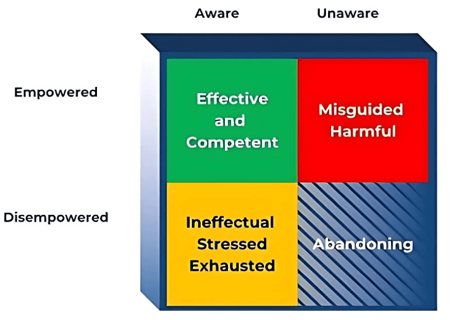 Position Four (lower left), may be the most common of all. In this position people are aware of what is going on but are either uncertain what to do or lack the internal or external resources to act in ways that would be helpful – or even to act at all. This position saps energy, enthusiasm and resolve. It can also result in moral distress, an experience in which one feels helpless to take the right course of action. To manage the distress, people often attempt to block out or numb themselves to the situation they face. By doing so they move “over” into Position Three.