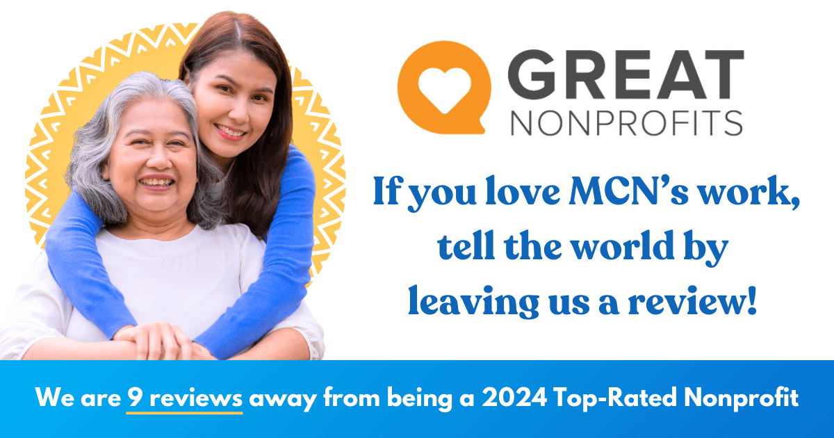 - Leave a review on GreatNonprofits: It’s an easy-to-use review site like Yelp that potential donors visit to see if a nonprofit is effective. This is a super impactful way to support MCN. Thank you in advance for sharing your story!