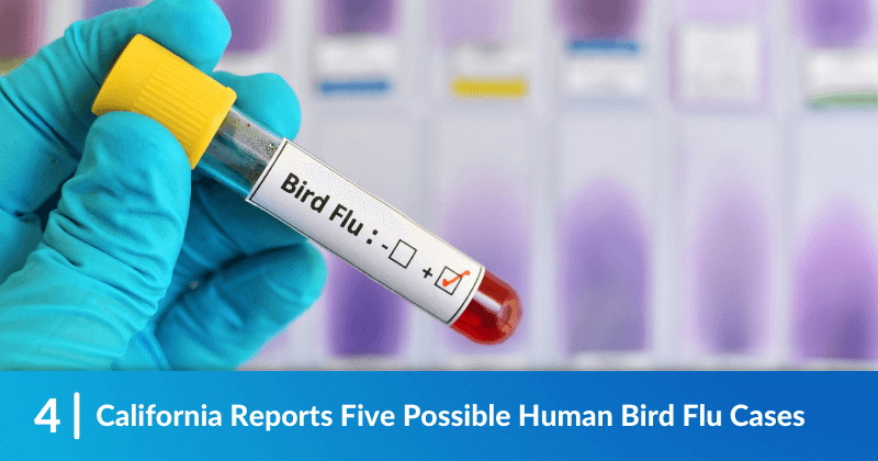 Avian flu is now in 100 dairies in California. Six cases have been confirmed among farmworkers and, now, another possible five are being investigated. California Reports Five Possible Human Bird Flu Cases