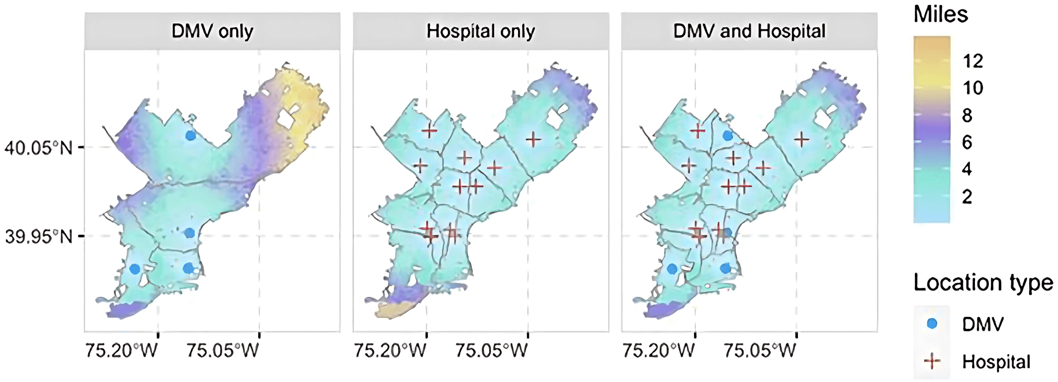 Drive distance mapped using 2020 census blocks in Philadelphia County, PA. Comparison of the drive distance if only DMVs were utilized for voter registration (left) compared to the service area size if only hospitals were utilized (middle) and if both hospitals and DMVs are utilized (right). If both DMVs and hospitals are utilized, all census blocks have a shorter drive distance to a voter registration site.