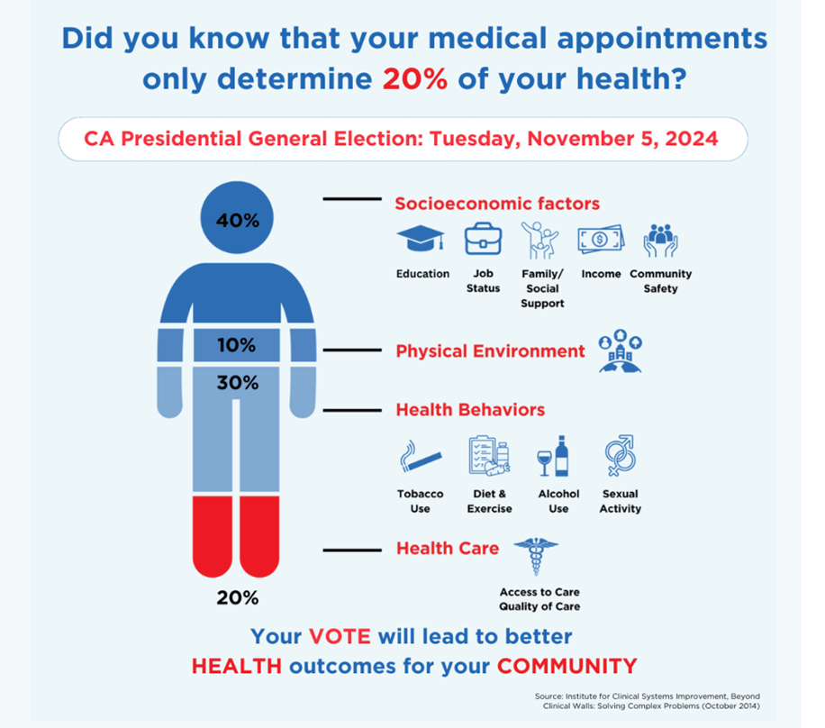 It shows that attending our medical appointments only accounts for 20% of our health. Socioeconomic factors like education, income, community safety, and our physical environment, like clean water and air, account for 50% of our health. That 50% is directly impacted by local, state, and national regulations and laws that are determined by those officials we elect. If we want to increase access to resources and services that promote health equity, then our vote matters.