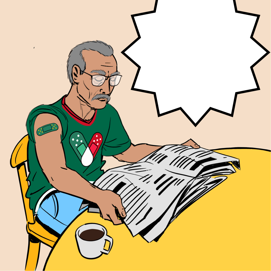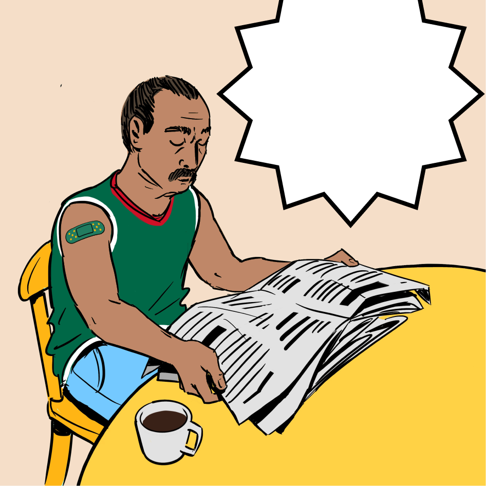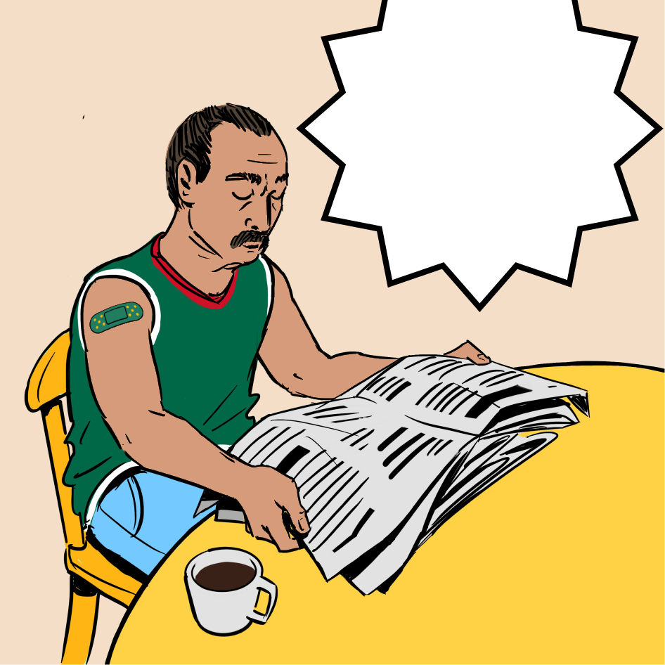Man In a Green Shirt Sitting at Table Reading Newspaper Option 1 | Option 2 | Option 3 | Option 4