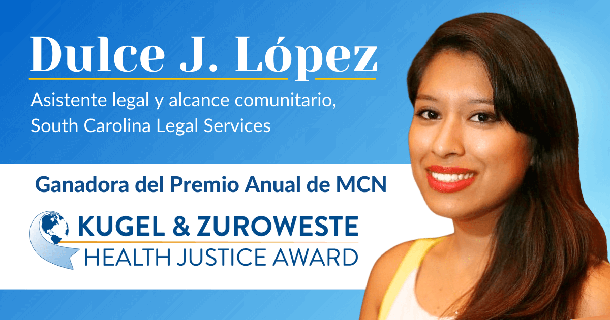 Dulce J. López, una de las galardonadas este año con el Premio Kugel y Zuroweste a la Justicia en Salud, ha tenido un gran impacto en su comunidad de trabajadores agrícolas de Carolina del Sur, a pesar de llevar sólo unos pocos años en el trabajo. "Como asistente legal bilingüe, el trabajo de Dulce es un ejemplo de nuestra definición amplia de 'clínico’", dijeron Candace Kugel, FMP y Ed Zuroweste, MD, al anunciar la selección de López para el prestigioso premio. "Ella se enfoca en asegurar que los trabajadores agrícolas de Carolina del Sur tengan acceso a los servicios de salud—alcanzando a 12.000 personas en los últimos cuatro años. Estamos encantados de tener la oportunidad de destacar y honrar las contribuciones de los miembros del equipo como Dulce."