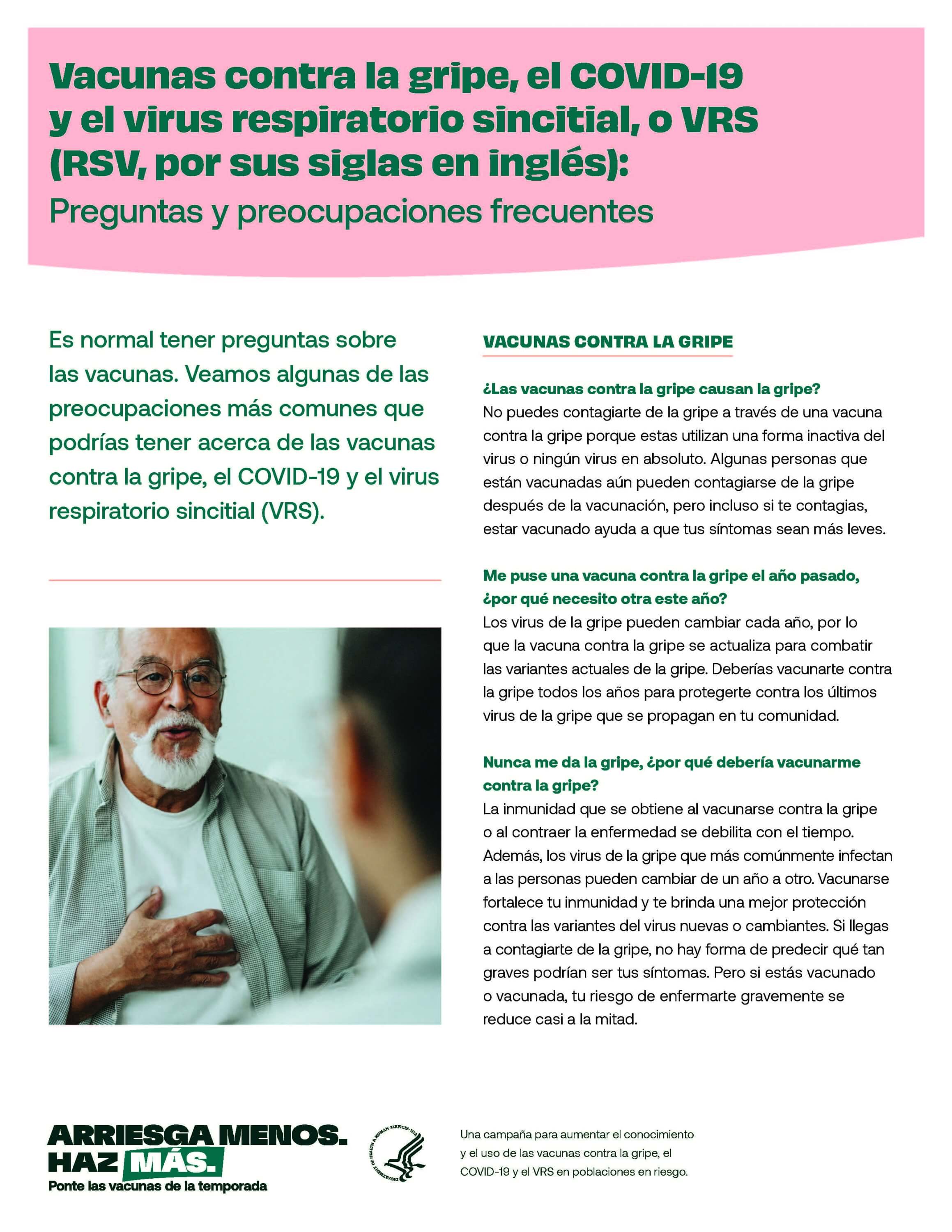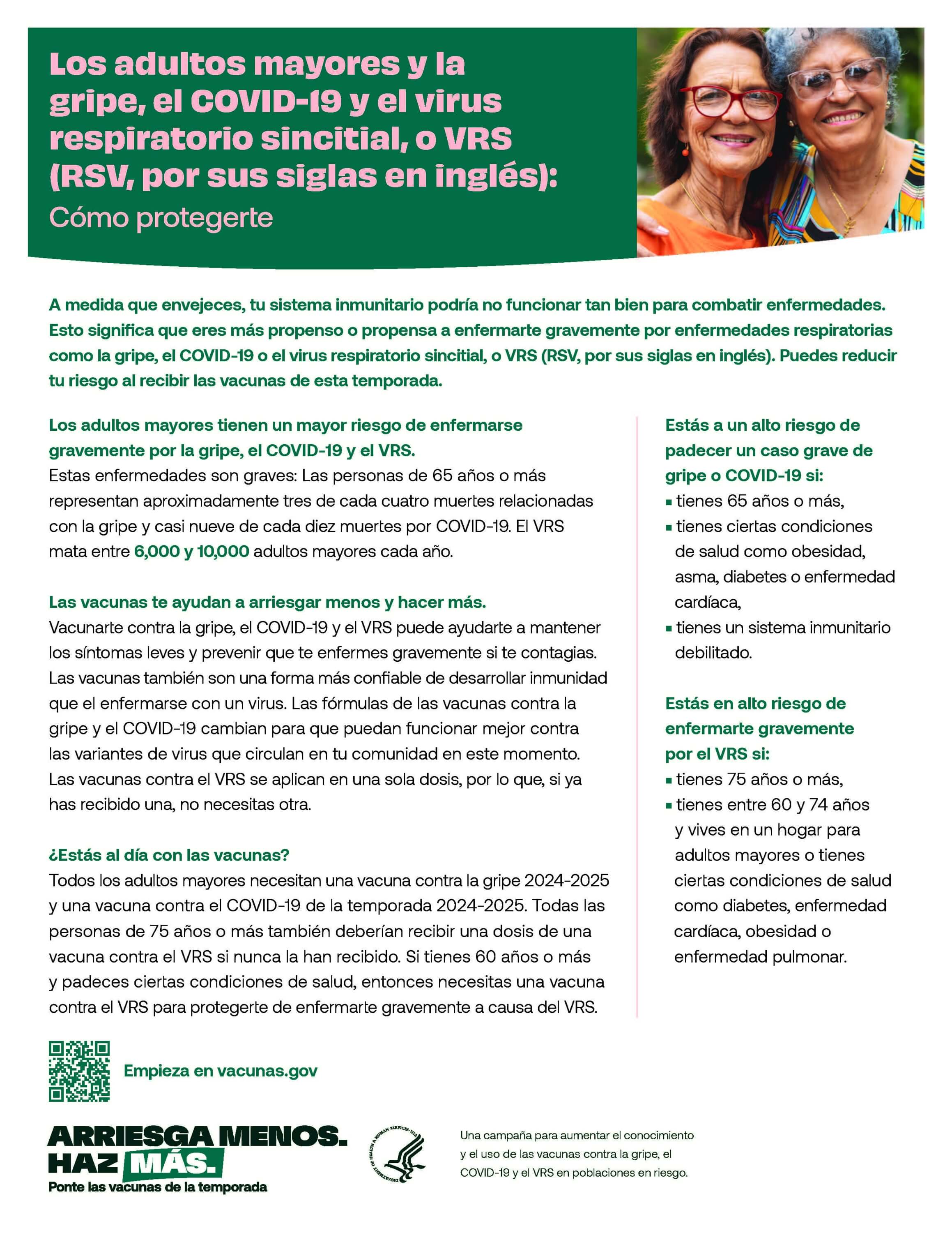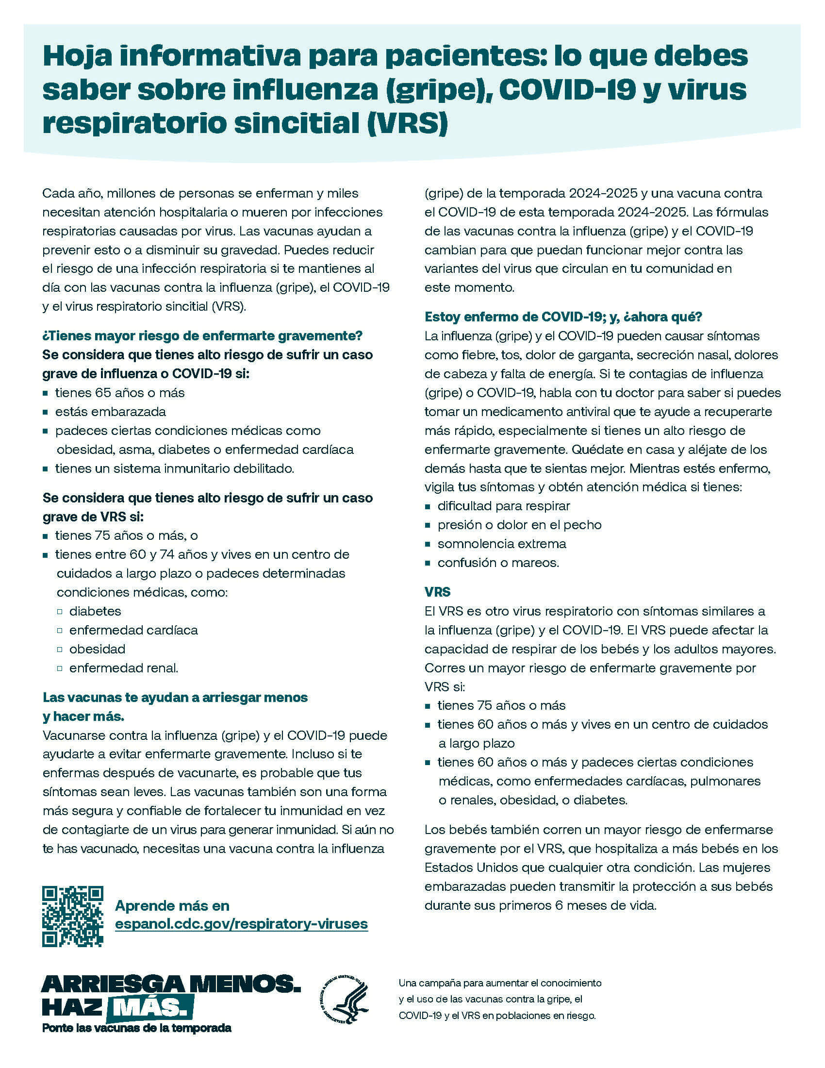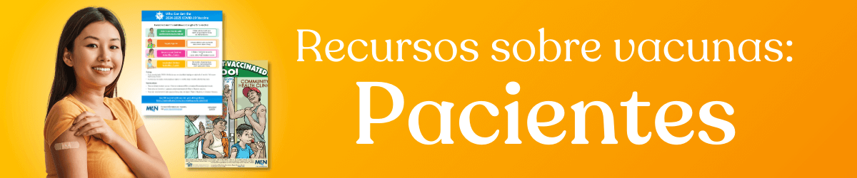 Recursos sobre vacunas: Pacientes Recursos de MCN Los grandes también se vacunan: Cómic sobre la vacunación Quién puede recibir la vacuna actualizada 2024-2025 contra COVID-19 Tríptico Protéjase contra COVID-19 para la audiencia en general Tríptico Los niños y la vacuna contra COVID-19 Qué esperar cuando se pone la vacuna contra COVID-19 Estuve expuesto o di positivo con COVID-19. ¿Qué hago ahora? Vacunas, respiradores y variantes de COVID-19 Otros Recursos El sitio web para obtener pruebas rápidas de COVID-19 Hoja informativa: Adultos mayores y la gripe, el COVID-19 y el virus respiratorio sincitial o VSR - Cómo protegerte - Health and Human Services Hoja informativa: Vacunas contra la gripe, el COVID-19 y el virus respiratorio sincitial o VSR: Preguntas y preocupaciones frecuentes - Health and Human Services Hoja informativa para pacientes: lo que debes saber sobre la influenza (gripe), COVID-19 y virus respiratorio sincitial (VRS) - Health and Human Services Póster: La gripe y COVID-19 - Lo que debes saber - Health and Human Services Póster: ¿Bebé a bordo? Vacúnate contra la gripe, el COVID-19 y el VSR - Health and Human Services Póster: ¿Qué es el VRS? ¿Necesitas una vacuna contra el VRS? - Health and Human Services Póster: Tres razones para vacunarte contra la influenza (gripe), el COVID-19 y el virus respiratorio sincitial (VRS) - Health and Human Services