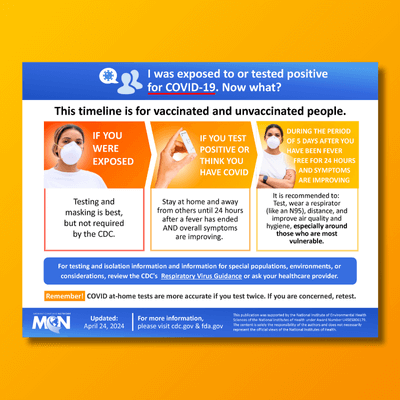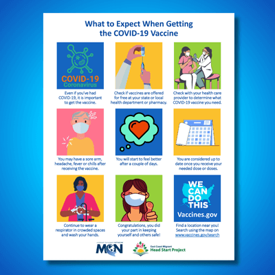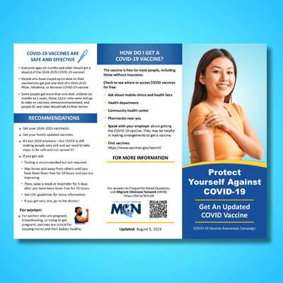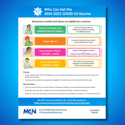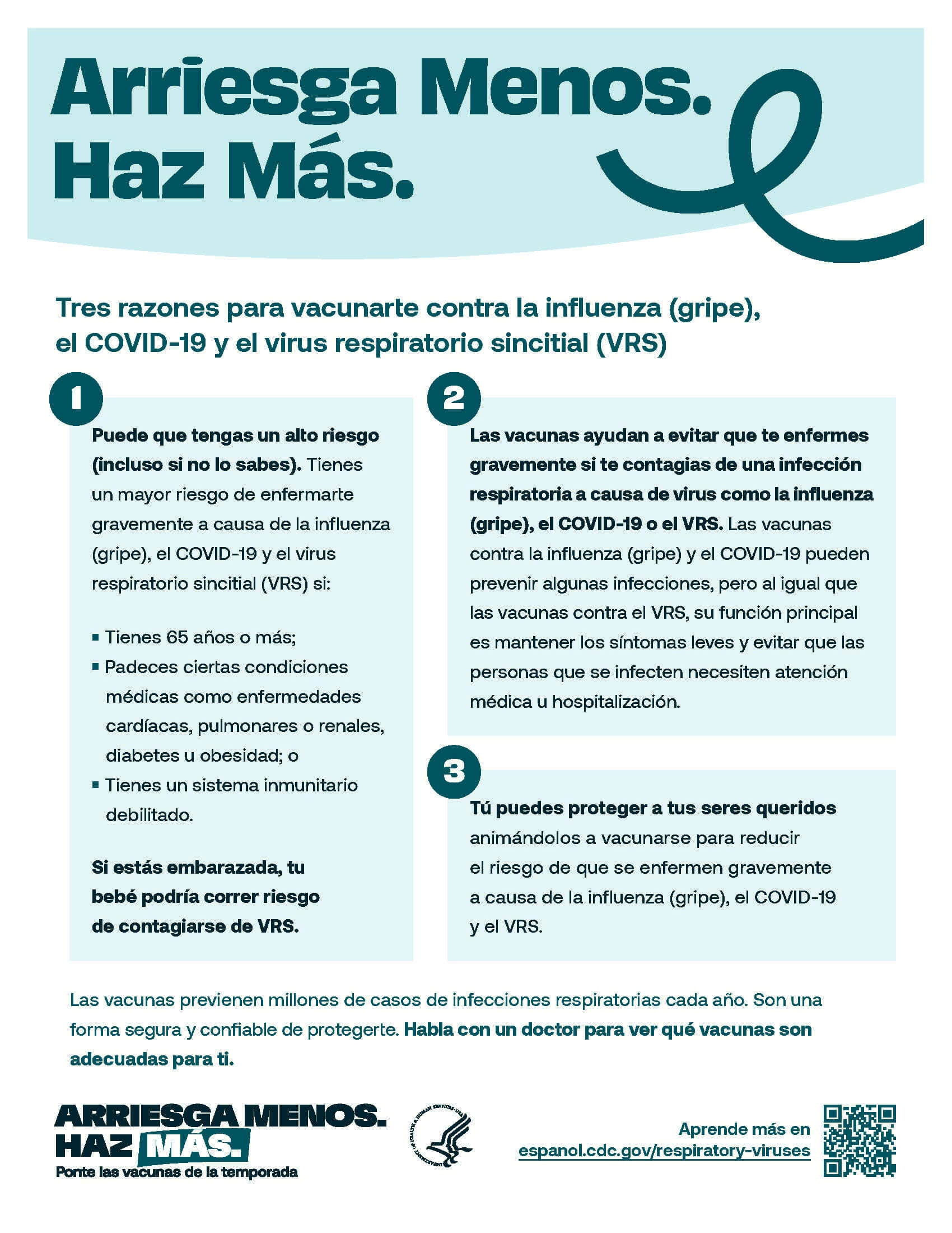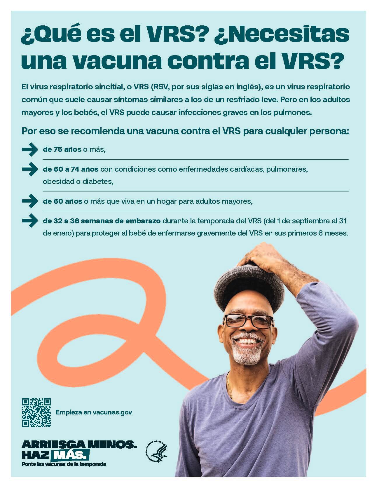 Recursos sobre vacunas: Pacientes Recursos de MCN Los grandes también se vacunan: Cómic sobre la vacunación Quién puede recibir la vacuna actualizada 2024-2025 contra COVID-19 Tríptico Protéjase contra COVID-19 para la audiencia en general Tríptico Los niños y la vacuna contra COVID-19 Qué esperar cuando se pone la vacuna contra COVID-19 Estuve expuesto o di positivo con COVID-19. ¿Qué hago ahora? Vacunas, respiradores y variantes de COVID-19 Otros Recursos El sitio web para obtener pruebas rápidas de COVID-19 Hoja informativa: Adultos mayores y la gripe, el COVID-19 y el virus respiratorio sincitial o VSR - Cómo protegerte - Health and Human Services Hoja informativa: Vacunas contra la gripe, el COVID-19 y el virus respiratorio sincitial o VSR: Preguntas y preocupaciones frecuentes - Health and Human Services Hoja informativa para pacientes: lo que debes saber sobre la influenza (gripe), COVID-19 y virus respiratorio sincitial (VRS) - Health and Human Services Póster: La gripe y COVID-19 - Lo que debes saber - Health and Human Services Póster: ¿Bebé a bordo? Vacúnate contra la gripe, el COVID-19 y el VSR - Health and Human Services Póster: ¿Qué es el VRS? ¿Necesitas una vacuna contra el VRS? - Health and Human Services Póster: Tres razones para vacunarte contra la influenza (gripe), el COVID-19 y el virus respiratorio sincitial (VRS) - Health and Human Services