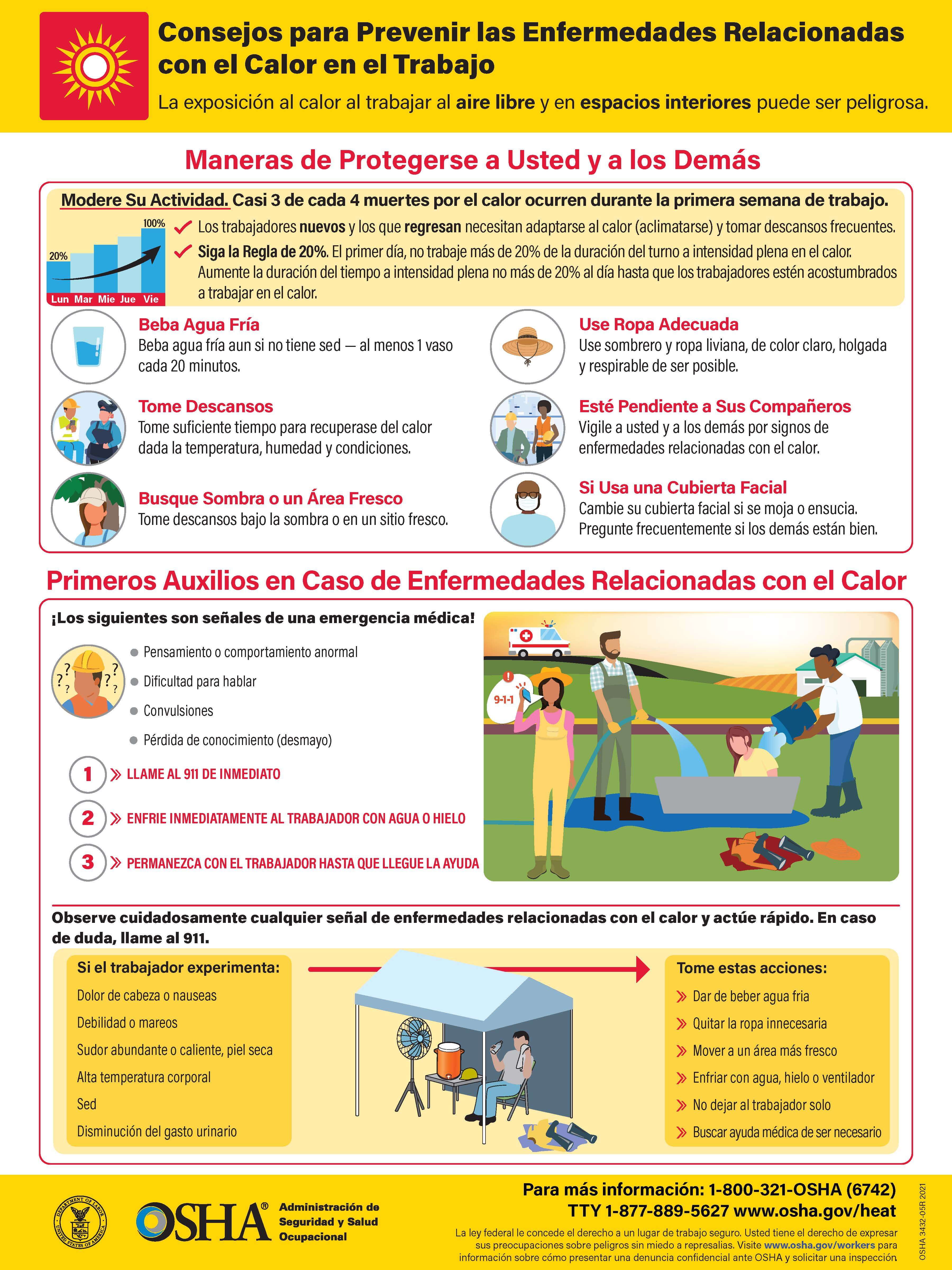 Download Resource OSHA - Consejos para Prevenir las Enfermedades Relacionadas con el Calor en el Trabajo (986.7 KB) OSHA - Consejos para Prevenir las Enfermedades Relacionadas con el Calor en el Trabajo ENGLISH (726.15 KB)