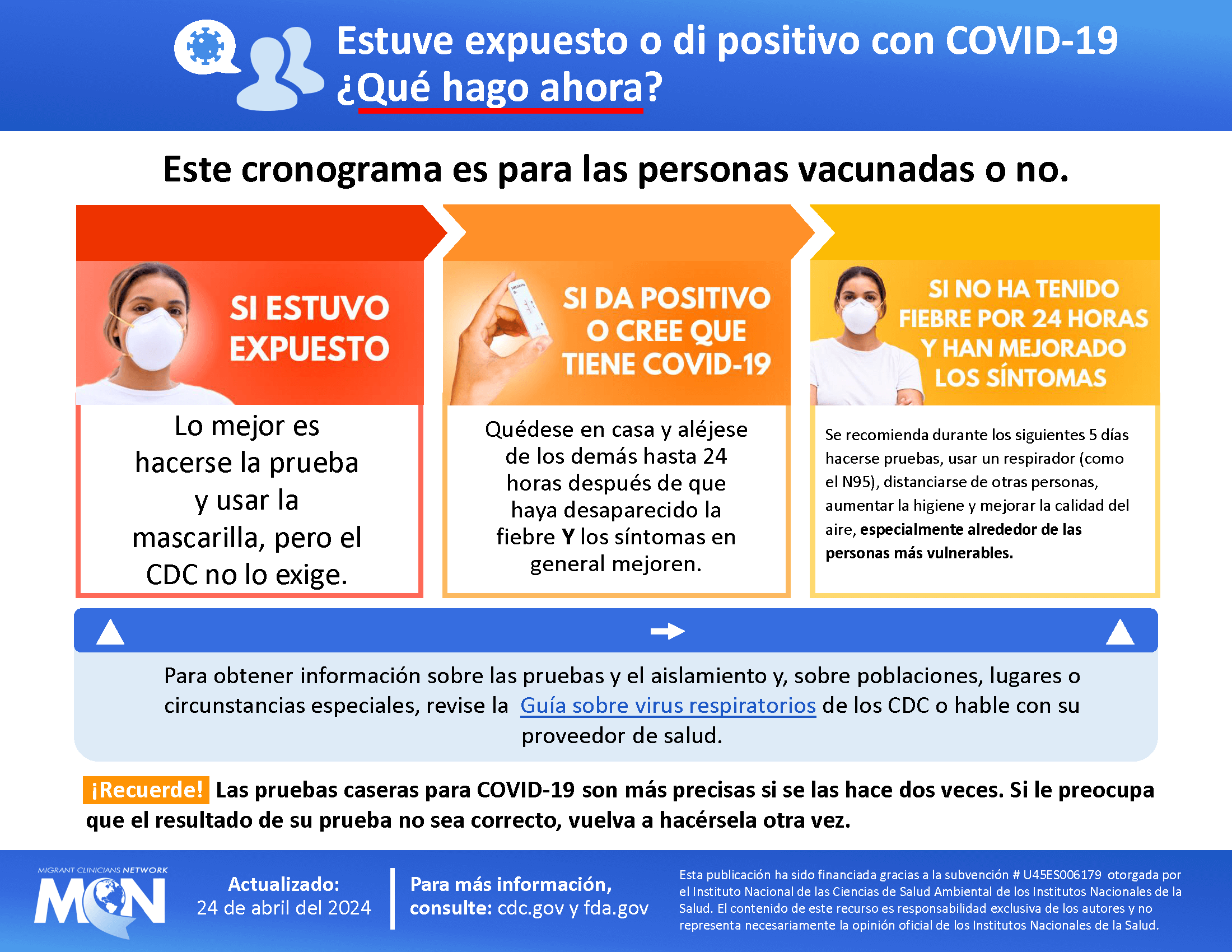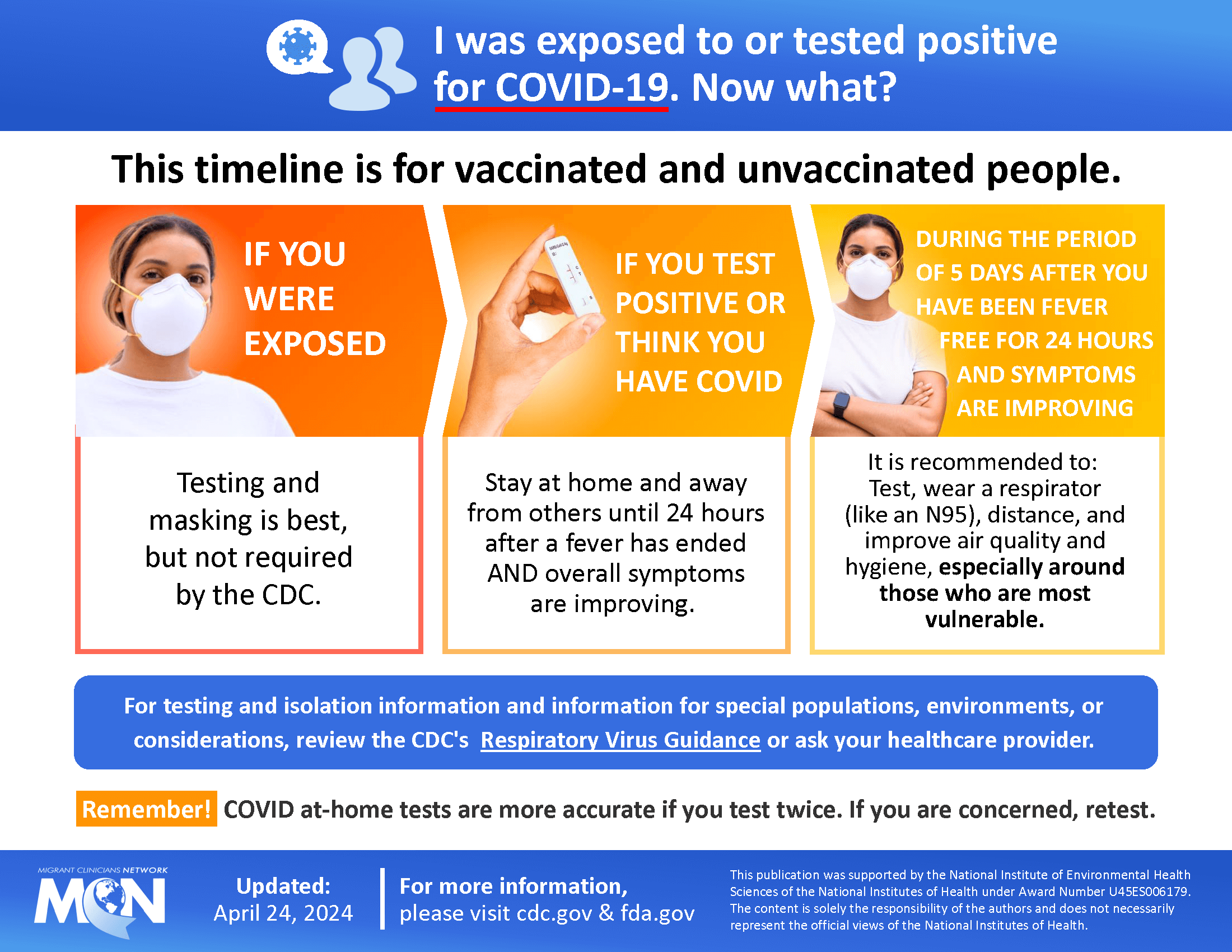 Download Resource I Was Exposed to or Tested Positive for COVID-19. Now what? - English - PDF (196.03 KB) I Was Exposed to or Tested Positive for COVID-19. Now what? - English - Image (264.49 KB) I Was Exposed to or Tested Positive for COVID-19. Now what? - Spanish - PDF (208.45 KB) I Was Exposed to or Tested Positive for COVID-19. Now what? - Spanish - Image (284.49 KB) URLs CDC | Respiratory Virus Guidance CDC | Respiratory Virus Guidance (Spanish)