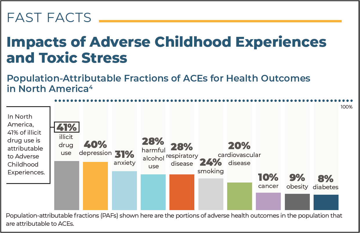 Those with four or more ACEs, compared to a person with no ACEs, have greater risks of heart disease, cancer, unintentional injuries, stroke, chronic lower respiratory disease, Alzheimer’s, diabetes, chronic liver disease and cirrhosis, and kidney disease. Significant percentages of leading health issues are attributable to ACEs. (See graphs.)