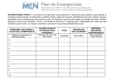 | Using this sample worksheet, a community in Puerto Rico with their local community health center to build a hyperlocal emergency plan with community buy-in. The instructions on the top: ask the participants to write challenges, concerns, or situations that may arise during the emergency; use their SWOT analysis and resource mapping to identify actions, next steps, or activities to address the challenges; indicate when the activity will occur (before, during, or after the emergency); and select a specific date or date range during which the activity will occur. |