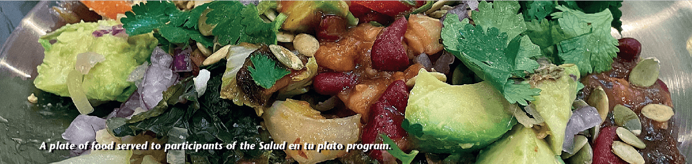 Salud en tu plato encourages participants to fill up their plates with one-quarter of a whole grain like corn tortillas, brown rice, quinoa, or hominy; one-quarter plant-based protein like pinto beans, lentils, chickpeas, tofu, or tempeh; and one-half vegetables like vegetable soup, green salad, sauteed broccoli, kale and mushroom stir fry.