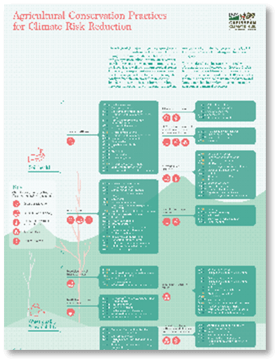 The USDA Natural Resource Conservation Service (NRCS) provides technical support, grants and incentives for the adoption of agricultural or conservation practices on farms and private lands that support farmers to adapt to and mitigate extreme weather-related phenomena impacts. The following resource on NRCS-supported practices can help you learn about them and support the process of applying for services or support.