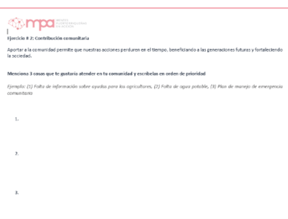 After carrying out the self-analysis where we contemplate who we are as a person and what are the values that define us individually, we move to identify what we can contribute to the community. This tool includes a practical exercise that will help to determine this possible community contribution.
