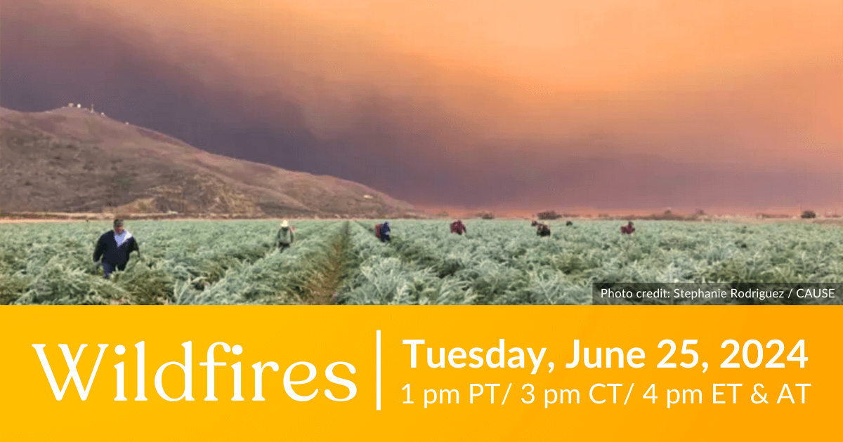 While entire communities and regions are impacted by wildfires and wildfire smoke, those on the front lines of our food supply are disproportionately impacted. Join Farmworker Justice and Migrant Clinicians Network for a webinar for clinicians and health center staff to learn more about wildfires and wildfire preparedness for migratory and seasonal agricultural workers communities. We will discuss the health effects of wildfires and strategies to support workers and their families during a wildfire emergency. Speakers include Dr. Maeve MacMurdo, director of the Cleveland Clinic Occupational Lung Disease Clinic, who is a specialist on occupational and environmental lung disease, and Deysi Merino Gonzalez, Program Manager at Vista Community Clinic in California. Health center staff will receive resources and strategies from clinical experts, MCN, and FJ. The webinar will be in English with Spanish interpretation.